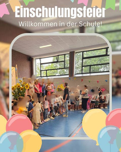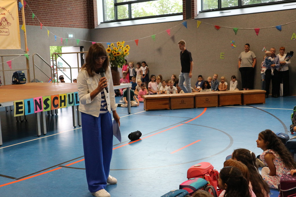 Am 16.08.2025 begann unsere Einschulungsfeier gemeinsam mit dem Kardinal-von-Galen-Haus und der Höner-Mark-Schule in der Pfarrkirche mit dem Gottesdienst „Volltreffer“. Im Anschluss daran fanden sich alle in der festlich geschmückten Turnhalle ein und wurden dort von der Schulleiterin, Frau Stottmann, herzlich begrüßt.